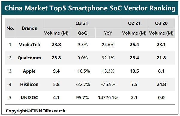 根據 CINNO Research 最新報告,預測 2021 年全年中國智能機 SoC 市場中聯發科為最大處理器廠商,市場占比預計增至 36%,高通預計增至 35%;中國 5G 智能機市場中高通則為最大處理器廠商,市場占比預計增至 37%,聯發科市場占比預計增至 34%。