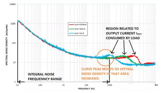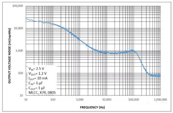 那么,我們如何測量噪聲呢?如前所述,內部噪聲是由輸入端有理想源的LDO產生的噪聲。在實際測量中,這個理想的源可能是電池,它比LDO穩壓器具有更低的內部噪聲。這種噪聲與頻率有關,它由一個參數表示,如頻譜噪聲密度曲線或積分噪聲值(在通常為10 Hz至100 kHz的特定頻率范圍內,輸出噪聲電壓以微伏- uVRMS表示)。