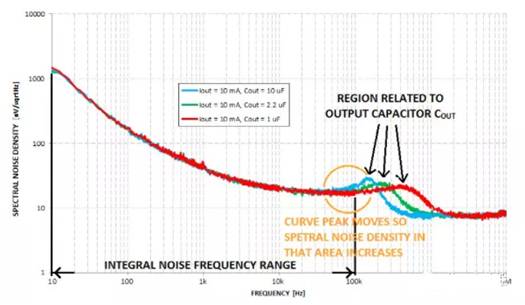 LDO輸出端的噪聲也與負載有關。負載消耗電流Iout,該電流值等于電阻 RLOAD。與負載相關的是多個RLOAD和輸出電容COUT。較高的RLOAD值或較高的 COUT值意味著與負載相關的曲線部分向較低頻率移動。在上面的圖片中,您可以看到與IOUT有關;在下面的圖片中,您可看到與COUT有關。