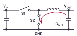 雖然簡單電壓轉換器可以從輸入電壓生成固定的輸出電壓,但在某些應用中,這種特性是不夠的。一個例子是控制與電容相連的電壓節點,這些電容可以充電至任何電壓。如果需要降低其電壓,則其必須部分放電。因此,在這樣的應用中,電源必須能夠根據需要提供或吸收電流。這種轉換器稱為四象限DC-DC轉換器。對于這樣的應用,可以使用具有輸出放電功能的電源。它可以讓輸出電容快速放電。圖1顯示了降壓型開關穩壓器的這種功能。這里,在降壓轉換器關閉之后,開關S2長時間接通,輸出電容被放電。