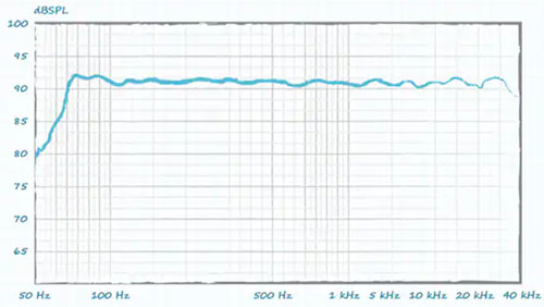 該圖表示在不同頻率下輸入恒定的功率會產生多少分貝的聲壓級,該圖相對平坦,整個頻譜范圍內的變化最小。除了 70 Hz 以下的部分急劇下降外,該音頻設備在相同輸入功率下,會在 20 Hz 和 70 kHz 范圍內產生穩定的聲壓級。任何低于 70 Hz 的設備都會產生較低的聲壓級 (SPL) 輸出。