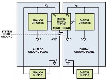 這樣就基本在混合信號器件上產生了系統“星型”接地。所有高噪聲數字電流通過數字電源流入數字接地層,再返回數字電源;與電路板敏感的模擬部分隔離開。系統星型接地結構出現在混合信號器件中模擬和數字接地層連接在一起的位置。