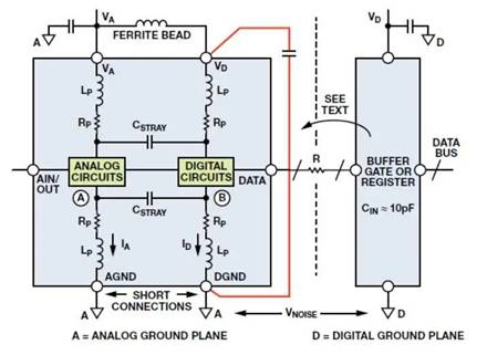 不過,為了防止進一步耦合,AGND 和 DGND 應通過最短的引線在外部連在一起,并接到模擬接地層。DGND 連接內的任何額外阻抗將在 B點產生更多數字噪聲;繼而使更多數字噪聲通過雜散電容耦合至模擬電路。請注意,將 DGND 連接到數字接地層會在 AGND 和 DGND 引腳兩端施加VNOISE,帶來嚴重問題!