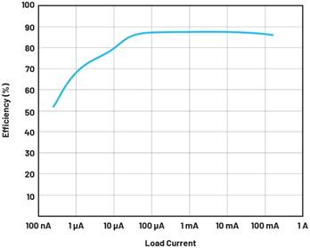 圖3中的效率曲線顯示了輸出電流非常低(如1 µA)時可以達到的效率。這就節省了大量能量,尤其是在長時間工作和低負載的應用中。