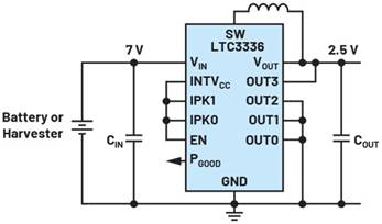 LTC3336代表了一類新的DC-DC轉換器。當產生輸出電壓且輸出端有低負載時,它在待機模式下僅消耗約65 nA的電流。圖2顯示了一個緊湊的電路例子,它從大約7 V的VIN產生2.5 V的輸出電壓。