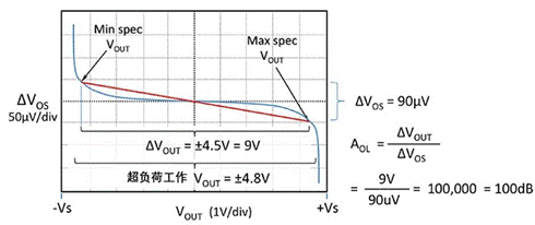 所以對于開環(huán)增益的定義,很多廠商(比如TI), 會在一個較大的輸出擺動范圍求其平均值,以實現(xiàn)良好的線性運行。比如選擇電源正軌道-0.6V,負(fù)軌道+0.6V來計算開環(huán)增益,如上圖紅線。