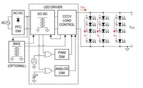 LED驅動器由DC-DC轉換器組成。負載控制;LED專用功能,例如調光;以及任何必要的保護功能。DC-DC轉換器提供與AC電源的安全隔離,同時將高壓PFC輸出轉換為適合LED負載要求的DC電流。當在大功率LED燈具中使用多個串并聯的LED串時,LED負載控制對于電流共享是必不可少的。