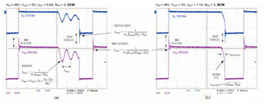 圖 2:以 DCM (a) 和 BCM (b) 模式運(yùn)行的反激式轉(zhuǎn)換器初級(jí)側(cè) MOSFET 和次級(jí)側(cè)二極管電壓波形;跨越初級(jí)側(cè)繞組的 DZ 電路可鉗位與漏電感相關(guān)的電壓尖峰
