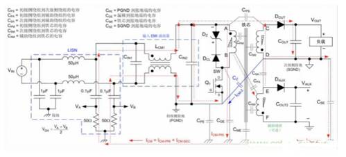 圖 3:雙線 DC-DC 反激式穩(wěn)壓器(輸入端連接有 LISN)的 CM 噪聲電流傳播路徑。同時(shí),還顯示了初級(jí)側(cè)基準(zhǔn)的輔助輸出端