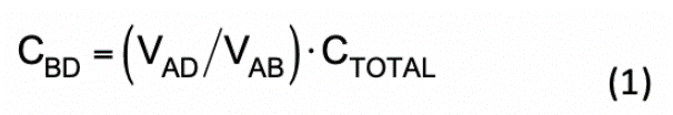 雙電容 CM 噪聲模型可靈活地用于不同的隔離型穩(wěn)壓器拓?fù)洌⒂兄谕ㄟ^實(shí)驗(yàn)測(cè)量推導(dǎo)出變壓器集總電容模型[13]。CTOTAL是用阻抗分析儀測(cè)得的變壓器結(jié)構(gòu)化繞組間電容,測(cè)量時(shí)將初級(jí)側(cè)和次級(jí)側(cè)端子短接,然后將變壓器用作單端口網(wǎng)絡(luò)。對(duì)初級(jí)側(cè)繞組端子(A、B)施加源阻抗為 50W 的開關(guān)頻率正弦激勵(lì)信號(hào),并測(cè)量 VAD與 VAB的電壓比,可由公式 1 推導(dǎo)出 CBD: