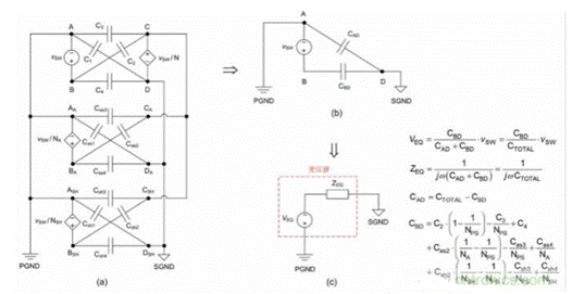 圖 6:(a) 多繞組反激式變壓器集總 CM 寄生電容模型;(b) 雙電容 CM 模型;(c) 戴維寧等效電路