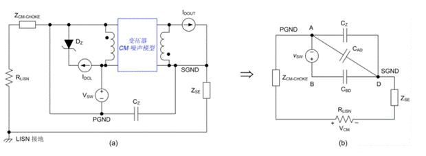 圖 7:(a) 基于替換定理的反激式電路模型;(b) 應(yīng)用疊加定理后反激式穩(wěn)壓器的最終 CM 模型