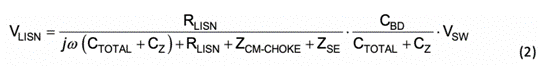 與電壓源并聯(lián)或與電流源串聯(lián)的元器件對(duì)網(wǎng)絡(luò)中的電壓或電流無(wú)影響,因此可以去除。疊加定理可幫助分別分析 IDCL、IDOUT和 VSW的作用。顯然,IDCL和 IDOUT已短路,不會(huì)產(chǎn)生 CM 噪聲。圖 7b 顯示的是最終 CM 模型,公式 2 可計(jì)算在 LISN 測(cè)得的 CM 噪聲電壓: