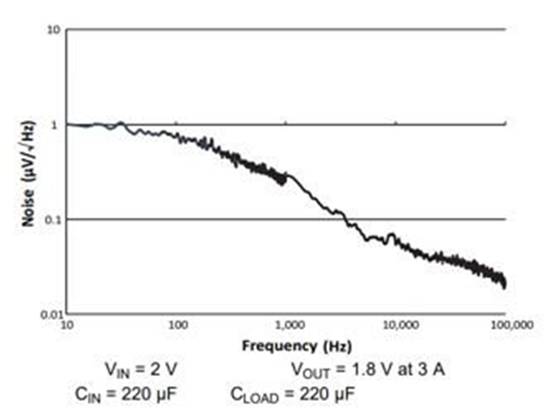 隨著衛星在太空中運行10年或更長時間,使機載集成電路充分發揮性能有助于確保設計壽命。為了向高性能時鐘、數據轉換器、數字信號處理器或模擬元件提供干凈、低噪聲的電源軌,LDO 電路需產生超小的內部噪聲。由于不容易濾除內部產生的 1/f 噪聲,因此應采用具有固有低噪聲特性的 LDO。低頻噪聲通常是最大的,也是最難濾除的。TPS7H1101A-SP 提供超低的 1/f 噪聲水平,在 10Hz 頻率下的峰值約為 1µV/√Hz。有關 RMS 噪聲隨頻率變化的情況,請參閱下面的圖 1。