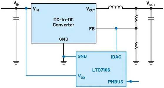 利用LTC7106等小型電流型DAC可以輕松實現(xiàn)輸出電壓的動態(tài)調(diào)整。該功能設(shè)計為以盡量少的接線實現(xiàn)可靠運行。