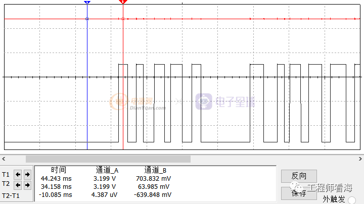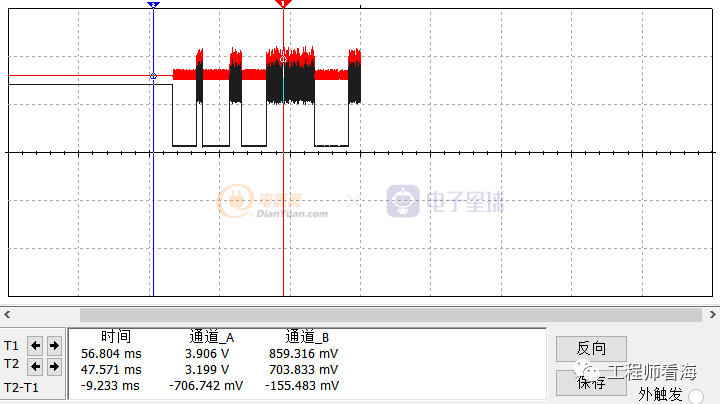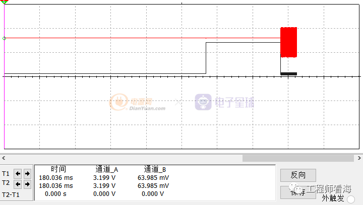 下圖是R4 ESR取0.1Ω時的輸出結果,黑色曲線是從70mA到700mA反復切換負載電流的電流波形,紅色是輸出電壓波形,可以看到電流變化時,輸出電壓只有微小的波動,整體還是穩定在3.2V。