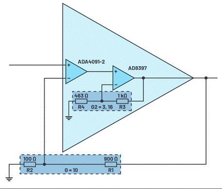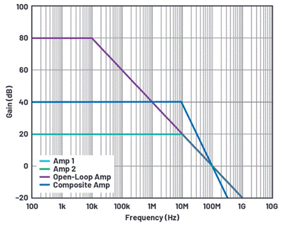 但是,您可以使用兩個單獨的放大器來構建這種放大器,形成復合放大器。將兩個運算放大器組合在一起,就能將各自的優勢特性集成于一體。這樣,與具有相同增益的單個放大器相比,兩個運算放大器組合可以實現更高的帶寬。