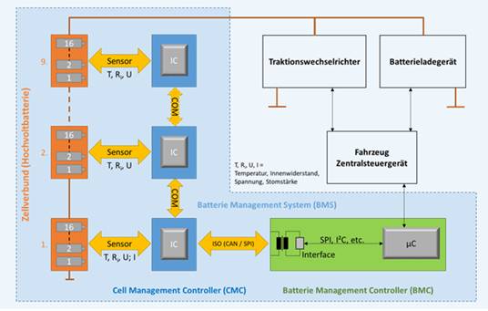 作為核心組件,電池管理系統(tǒng) (BMS) 負責電池的正確管理和監(jiān)測。目前,電動汽車采用鋰離子電池。這些電池連接在一起使電池組達到所需總電壓。現有單體電池電壓約為3.6 V至3.7 V,動力電池520 V或900 V高壓系統(tǒng)需要約140至250節(jié)電池。這種配置中,必須監(jiān)測電池的溫度、阻抗(電池內阻)、電壓以及充放電電流。