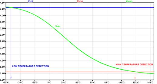 這種熱敏電阻還具有較高的熱循環(huán)耐受能力,高溫下阻值漂移較低。NTC熱敏電阻可放在TNPW / TNPU系列固定電阻網絡中—TNPW/TNPU系列電阻具有超精密公差,電阻熱系數低至± 0.1 %,± 25 ppm/℃,或者放在可支持± 0.05 %相對公差和0.1%絕對公差的ACAS網絡電阻中(圖4)。控制芯片對NTC熱敏電阻 (Vntc) 產生的電壓進行采樣,并檢測高低閾值。