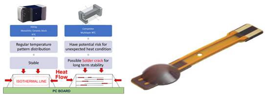 圖3 – NTC參考設計、技術性能對比以及NTCAFLEX05系列柔性箔傳感器參考設計;圖片來源:Vishay
