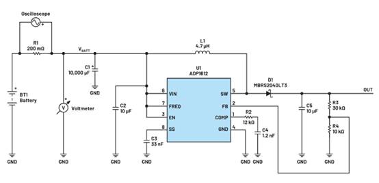 之后,將圖1所示的電路轉(zhuǎn)換為自舉配置。自舉涉及到將ADP1612的VIN引腳連接至輸出電壓。該部分啟動(dòng)后,由更高的輸出電壓供電,因此會(huì)產(chǎn)生更強(qiáng)的驅(qū)動(dòng)力來(lái)驅(qū)動(dòng)FET,但ADP1612并不知道電池的電壓水平。經(jīng)過(guò)修改的電路如圖4所示。