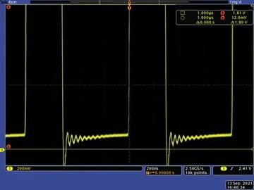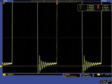 通過(guò)探測(cè)開(kāi)關(guān)節(jié)點(diǎn)(SW),可以深入了解DC-DC轉(zhuǎn)換器是如何工作的。在FET接通時(shí),電感電流升高,導(dǎo)致開(kāi)關(guān)節(jié)點(diǎn)的底部電壓升高,幅度與FET的導(dǎo)通電阻成正比。此電壓越低,F(xiàn)ET的導(dǎo)通電阻越低。因此,在給定電流下,F(xiàn)ET中的損耗也越低。圖2顯示了采用非自舉配置的開(kāi)關(guān)節(jié)點(diǎn),電池電壓為2 V。開(kāi)關(guān)節(jié)點(diǎn)的底部電壓峰值約為180 mV。