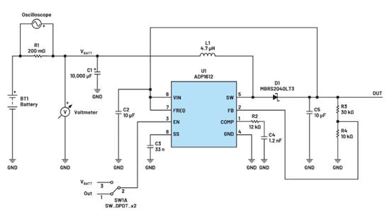 圖1顯示了ADP1612的標(biāo)準(zhǔn)評(píng)估套件。其中增加了一個(gè)200 mΩ電流檢測(cè)電阻,與電池輸入串聯(lián),用于測(cè)量輸入電流。在電池輸入電路中增加了一個(gè)大型電解電容,用于平滑電感器的電流峰值,以便能夠高度準(zhǔn)確地測(cè)量檢測(cè)電阻上的平均電池電流。電池電壓由數(shù)字電壓表進(jìn)行測(cè)量,因此,可以用電池電壓乘以輸入電流來(lái)計(jì)算輸入功率。在輸出端增加阻性負(fù)載,用輸出功率除以輸入功率,計(jì)算得出轉(zhuǎn)換器的效率。