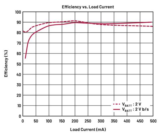 我們還可以看出,在電池電壓降低時(shí),因?yàn)镕ET驅(qū)動(dòng)力更高,所以自舉電路的重負(fù)載電流(高于約260 mA)的效率開(kāi)始改善。
