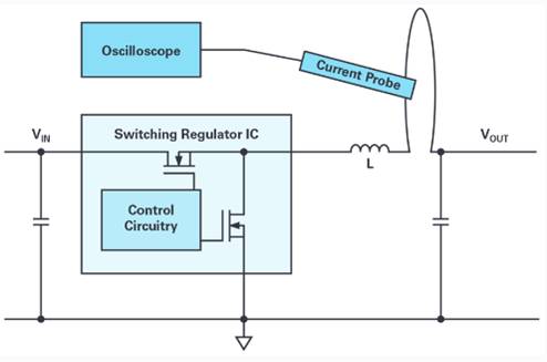 圖1以典型的降壓型轉換器(降壓拓撲)為例,顯示了針對這類測量的建議設置。接入一根輔助小電纜與電感串聯。將它用來連接一個電流探頭,并通過示波器顯示電感電流。建議在電感具有穩定電壓的那一側進行測量。