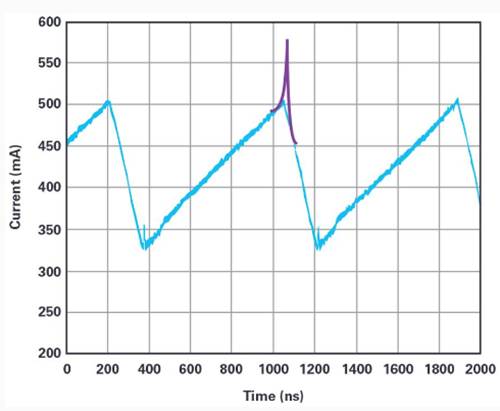 圖3. 電感電流的測量結果顯示為藍色,飽和電感的行為顯示為附加的紫色。