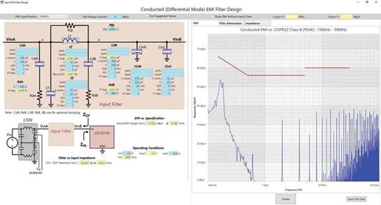 在經(jīng)過認(rèn)證的測(cè)試實(shí)驗(yàn)室進(jìn)行EMI測(cè)量的成本很高。修改已經(jīng)開發(fā)好的硬件也很昂貴。因此,電壓轉(zhuǎn)換電路設(shè)計(jì)的另一個(gè)重要支柱是使用ADI LTpowerCAD®等工具進(jìn)行EMC優(yōu)化。在開發(fā)過程中使用仿真工具實(shí)現(xiàn)EMC優(yōu)化具有巨大的潛力。圖3顯示了作為L(zhǎng)TpowerCAD開發(fā)環(huán)境一部分的EMI濾波器設(shè)計(jì)器。利用此工具可以計(jì)算開關(guān)穩(wěn)壓器的傳導(dǎo)發(fā)射,如果干擾太高,可以設(shè)計(jì)濾波器來提供補(bǔ)救措施。