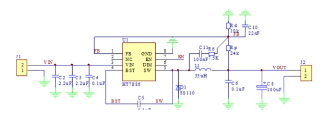(3)使用電解電容 使用電解電容器時,正向電阻、電容(C11 和 R6)改為 FB 連接到 SW,如下 圖所示。需要注意的是,該種連接方式的動態響應會變慢。