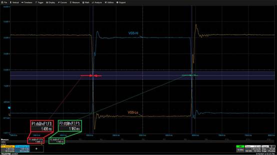 圖 2:初級空載時間是通過比較在最大控制器脈沖寬度下、高壓側和低壓側 FET 的 VGS 轉換時間來測量的。兩組轉換之間的延遲就是空載時間。在這個例子中,空載時間是1.498 ns 和 1.166 ns。(圖片來源:Art Pini)