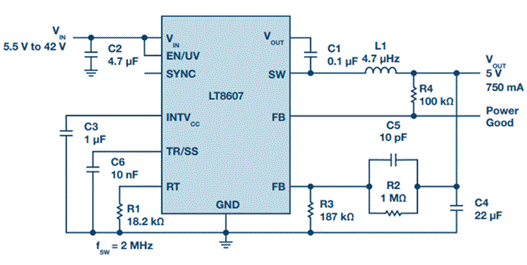 圖1示出了一款基于10引腳LT8607穩(wěn)壓器的5