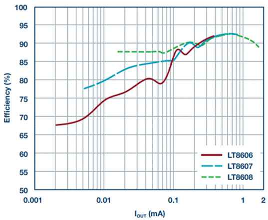 對于電池供電型應(yīng)用來說,在輕負(fù)載運(yùn)行和無負(fù)載待用模式期間,高效率和低閑置電流是非常重要的特性。LT8606/LT8607/LT8608的2.5