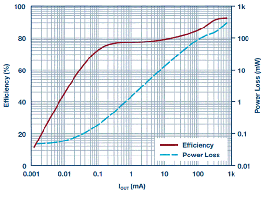 VOUT降壓型轉(zhuǎn)換器的效率 與負(fù)載電流關(guān)系曲線。