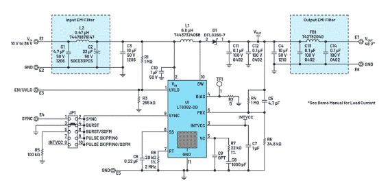 我們可以使用LT8362升壓轉換器構建一個高性能電源,該轉換器采用60 V、2 A開關,工作頻率最高可達2 MHz,且采用3 mm × 3 mm小型封裝。下面的電路基于標準的LT8362演示板 DC2628A, 其原理圖如圖1所示。