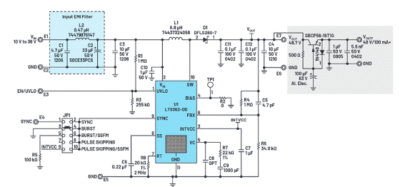 第二種方法是將LT8362 輸出增大1 V或2 V,并在輸出端增加一個LDO穩壓器。這需要采用高壓LDO穩壓器,其成本一般高于低壓穩壓器。此外,雖然這些穩壓器在低輸出電壓下具有低噪聲,但是使用基準電壓的器件 也會遇到與LT8362一樣的基準電壓源噪聲倍增問題。