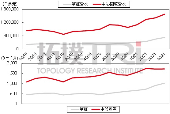 ▲ 2018~2021年每季中芯國際與華虹半導體營收與晶圓銷售量。(Source:公司財報;拓墣產業研究院整理,2022.4)