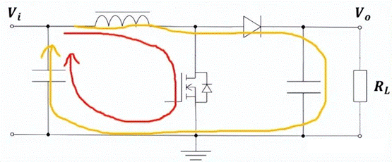 下面是Boost升壓DC/DC電路電流環(huán)路的情況,來聊聊電感底部敷銅對電源設(shè)計(jì)的影響。