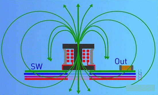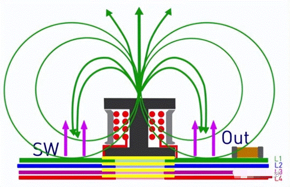 當(dāng)Boost升壓正常工作時(shí),電感中流過負(fù)載電流,形成回路。由于開關(guān)管的存在,電流是動(dòng)態(tài)變化的,由此可形成電感的磁感線,在導(dǎo)體的表面部分磁感線回形成封閉的磁回路,部分磁路會(huì)形成漏磁溢出到空氣中。如果電感底部沒有敷銅時(shí),從電感中溢出的磁感線會(huì)在整個(gè)電源系統(tǒng)中存在,使系統(tǒng)沒有相對安靜的空間,會(huì)造成EMI的性能下降。