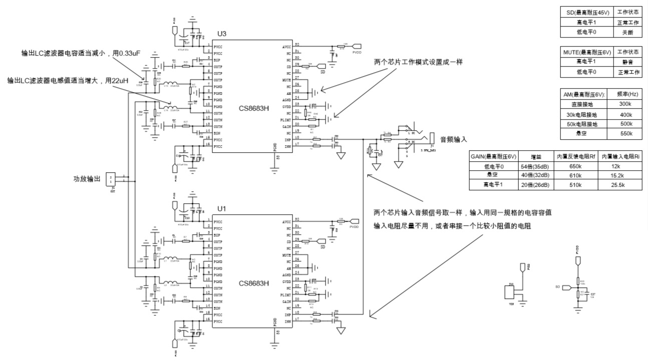 | 兩顆CS8683并聯輸出單聲道200W/4歐應用原理圖 |
