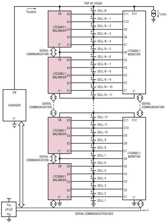當應用于串接式鋰離子電池的BMS系統(tǒng)時,LTC3300-1組成的電池組平衡器是系統(tǒng)中的關鍵部件,能夠和監(jiān)視器、充電器、微處理器或微控制器協(xié)同工作。圖4是LTC3300-1應用于BMS系統(tǒng)的原理圖,電池組平衡器在系統(tǒng)中的作用是,針對某一個給定的失衡電池與相鄰的較大的電池組(其包含失衡電池)進行電荷轉移,以達到單電池和整個電池組的電壓或容量平衡。