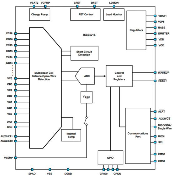 圖6是ISL94216x電池前端IC的系統(tǒng)框圖,展現了該器件的集成特性。該器件支持I2C、SPI和單線協(xié)議棧,可在電池管理解決方案中連接MCU。