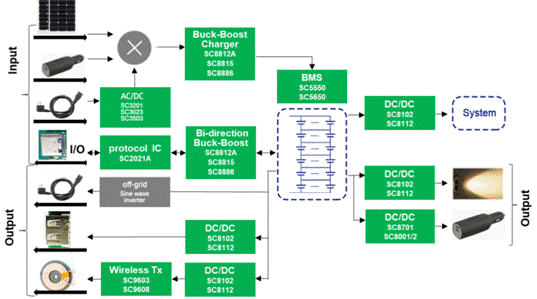 便攜式儲能電源的系統架構,與我們常見的充電寶較為類似,但輸入輸出功率更大、功能更多,對安全性、可靠性的要求也更高。下圖為便攜式儲能系統的內部功能架構圖,其中綠色部分為南芯半導體可提供的芯片方案。