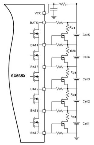 多串電池在使用中容易產生電芯不均衡問題,影響電池的使用壽命。與SC5550 同系列的SC5650, 在支持SC5550的基礎上,集成了100mA 的均衡功能。如需更高均衡電流,也可通過外加MOSFET拓展外部均衡電路。