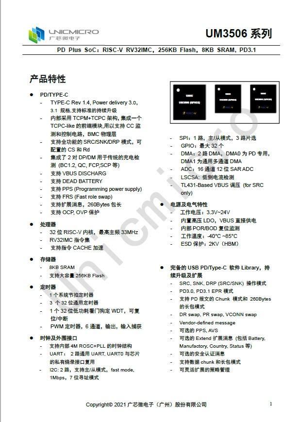 封裝封面,UM3506家族共有多個(gè)封裝尺寸,分別是QFN32、QFN24,適用于工程師根據(jù)PCB大小布局進(jìn)行方案開(kāi)發(fā)設(shè)計(jì)。充電頭網(wǎng)向廣芯微了解到,UM3506系列采用了當(dāng)下關(guān)注度相當(dāng)高的RISC-V架構(gòu),這也是業(yè)界率先將RISC-V與USB PD3.1相結(jié)合的快充芯片。