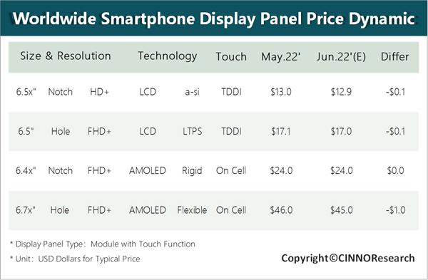此外,報(bào)告預(yù)計(jì) 2022 年 6 月和 7 月柔性 AMOLED 面板價(jià)格將繼續(xù)下降 1 美元,LCD 面板價(jià)格則仍將下降 0.1 美元。