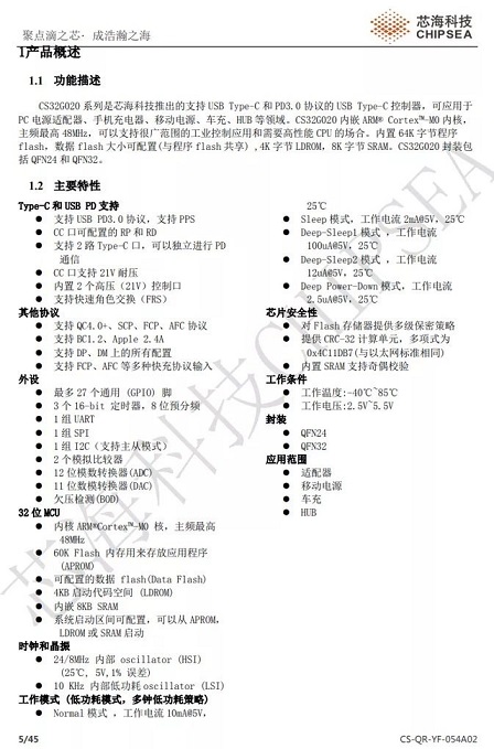 芯海科技CS32G020是芯海科技推出的支持USB Type-C和USB PD3.0協議的USB Type-C控制器,內置ARM M0內核,48MHz主頻,內置64K程序存儲器,4KB LDROM,8K SRAM,支持寬范圍的工業控制應用和高性能處理場景,提供QFN24和QFN32封裝,適用于PC電源適配器、手機快充充電器、大功率移動電源、車充、USB HUB等領域。