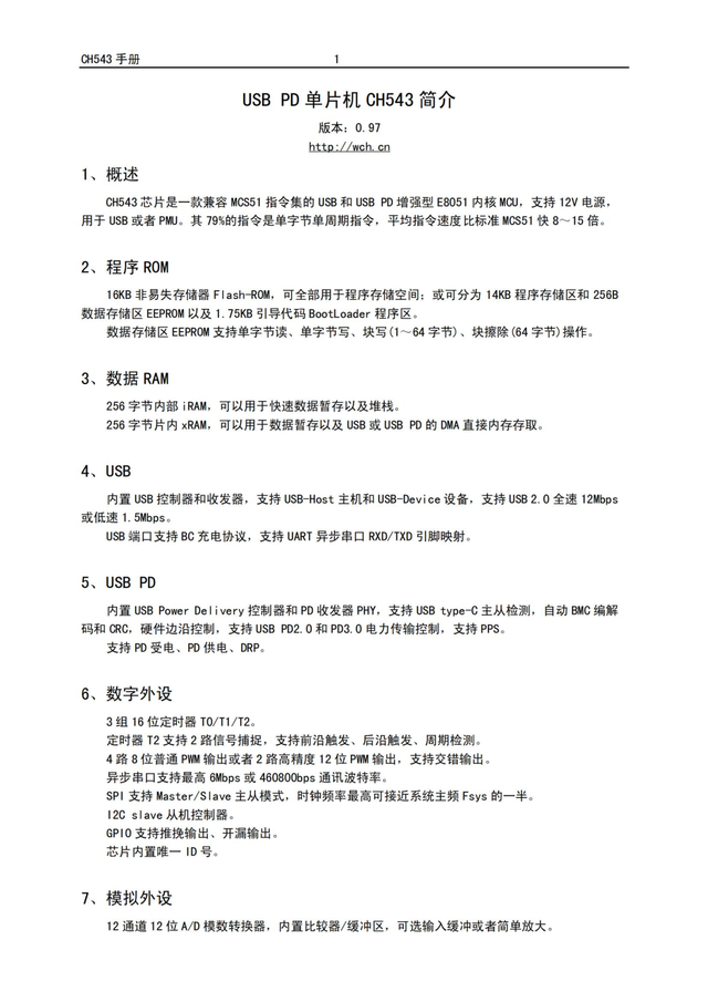 沁恒微CH543 芯片是一款兼容 MCS51 指令集的 USB 和 USB PD 增強型 E8051 內核 MCU,支持 12V 電源, 用于 USB 或者 PMU。其 79%的指令是單字節單周期指令,平均指令速度比標準 MCS51 快 8~15 倍。